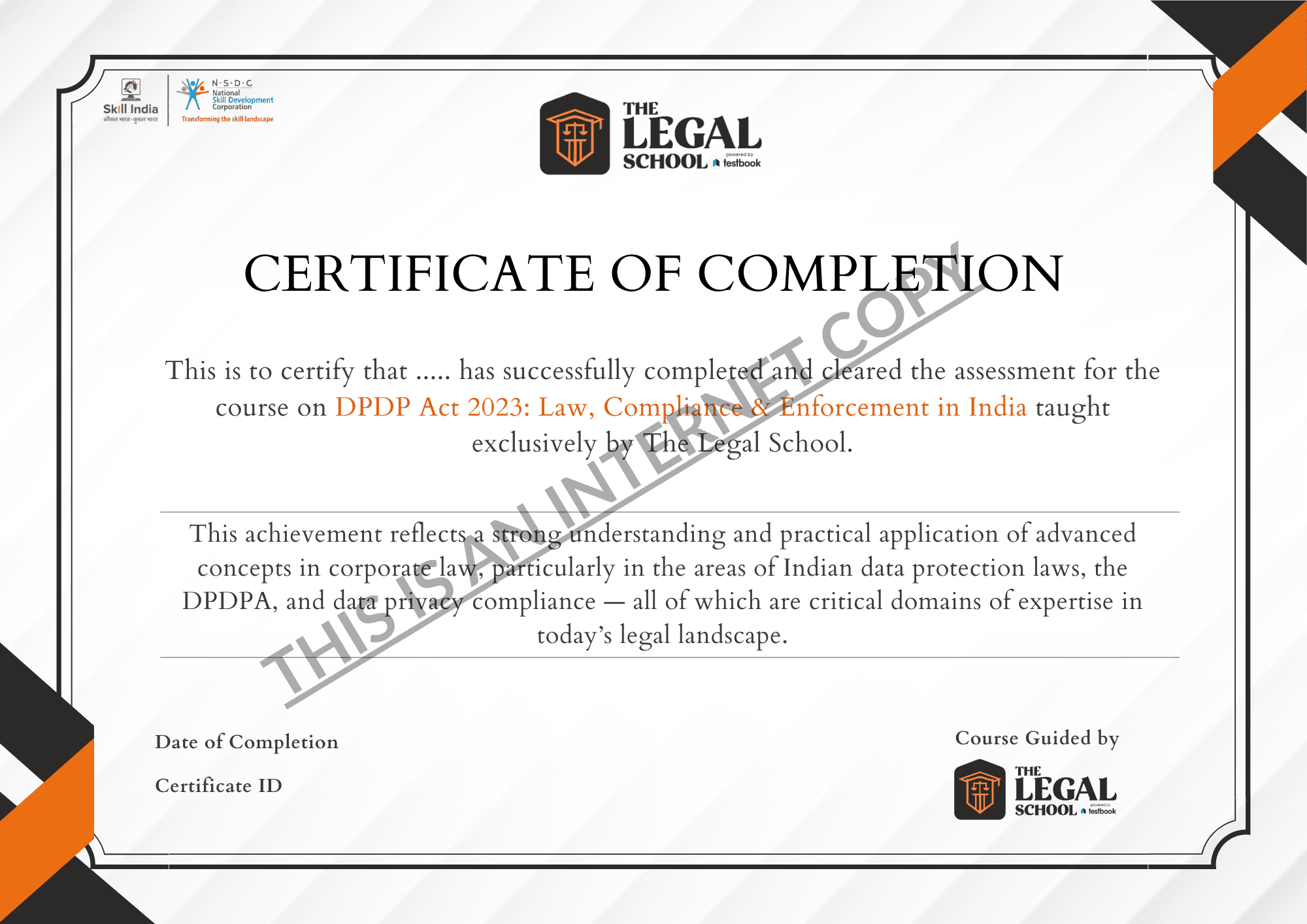 Earn a prestigious Certificate of Achievement for completing the comprehensive course on DPDP Act 2023: Law, Compliance & Enforcement in India. Curated with guidance from industry experts and taught exclusively by The Legal School, this certification validates your advanced understanding and practical expertise in data privacy, compliance, and global regulatory frameworks. Proudly showcase this credential as a mark of excellence in your legal career and stand out in the ever-evolving field of data protection.